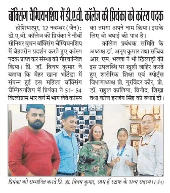 Priyanka, a student of DAV College Hoshiarpur, delivered an outstanding performance in boxing by securing a bronze medal in the 51–54 kg weight category. College Principal Prof. (Dr.) Vinay Kumar shared that Priyanka earned this honour at the 9th Senior Women’s Boxing Championship held from November 4 to 6 at Maiser khana, Bathinda. Dr. Anoop Kumar, President of the College Managing Committee, and Shri R.M. Bhalla, Secretary, expressed their happiness over the student’s achievement and extended best wishes for her future. On this occasion, Associate Prof. Gurvinder Kaur, Dr. Rahul Kalia, Shri Vinod, and Madam Shikha were also present.