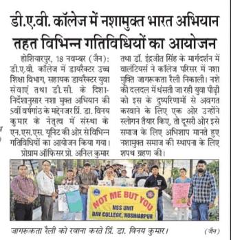 Drug-Free Society Awareness Activities Organized at D.A.V. College, HoshiarpurIn line with the directives of the Punjab Government, D.A.V. College, Hoshiarpur organized a series of activities dedicated to the vision of a drug-free society under the leadership of College Principal Prof. (Dr.) Vinay Kumar. College NSS Unit, led by Programme Officers Associate Prof. Anil Kumar and Dr. Inderjit Singh, marked the fifth anniversary of the Nasha Mukt Bharat Abhiyan with impactful initiatives. Students took a solemn pledge to contribute towards building a society free from drugs, followed by a rally across the college campus. During the rally, NSS volunteers displayed creative slogans highlighting the harmful effects of substance abuse, thereby spreading awareness among peers and the wider community.